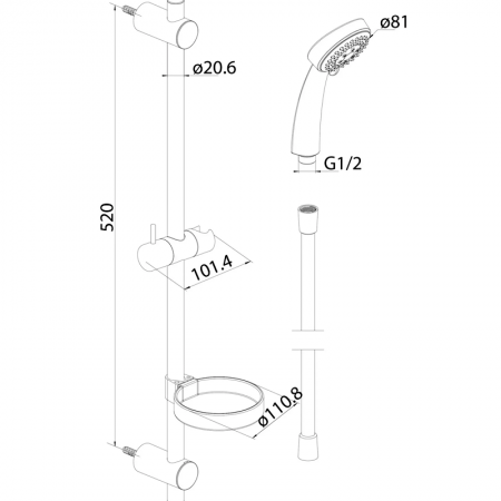760100310 Contour, душ.комплект: ручн.душ 3 ф-ції d 81 мм, штанга 600 мм, шланг 1750 мм, шт ( (1 сор