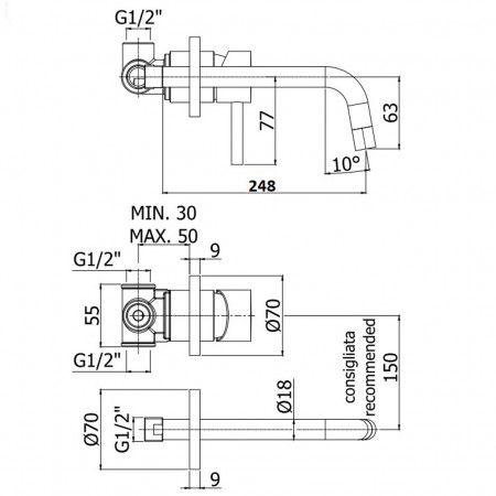 LIG007ST70 LIGHT Змішувач для раковини зі стіни, вилив 245 мм, steel looking (1 сорт)
