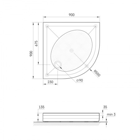 DPARTRO90R550W/00 ART RO 90 R550 Піддон душовий 1/4 круга 90х90 см з литого (штучного) каменю з ніжк