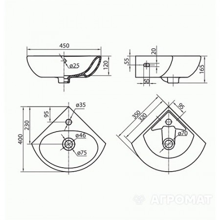 L82735000 RUNA Раковина кутова 35 см, 3 1 отв.під зміш., з переливом, білий глянець (1 сорт)