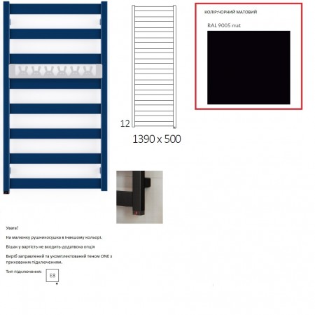 WWVON139050K9M5E8P Рушникосушка електрична Terma VIVO ONE 1390*500, колір RAL 9005 mat (чорний мат),