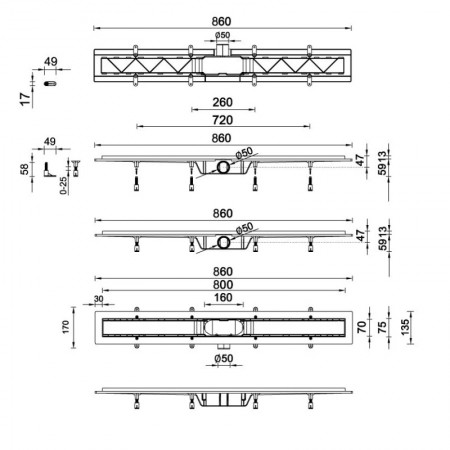 STY-F-80 Душевий канал з решіткою під плитку 800 мм із сухим затвором (1 сорт)