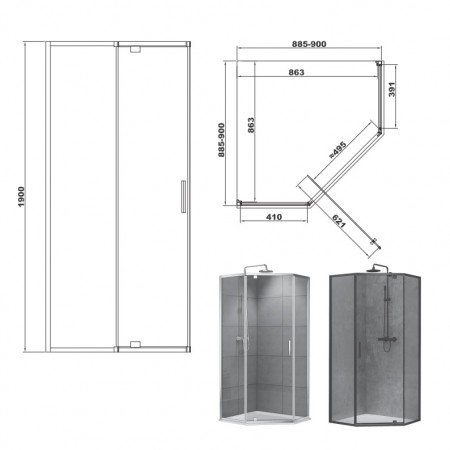 FEN0140 ART 2.0 Кабіна душова, п'ятикутна, розпашна, хром, 900*900, без піддона, скло прозоре (1 сор