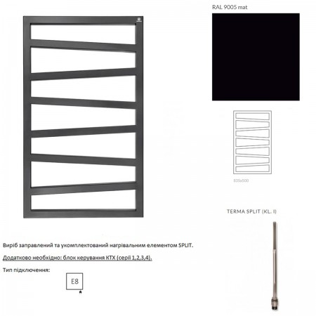 WLZIG083050K9M5E8TS1D Рушникосушка електрична Terma ZIGZAG 835*500 ,колір Ral 9005 mat (чорний мат),
