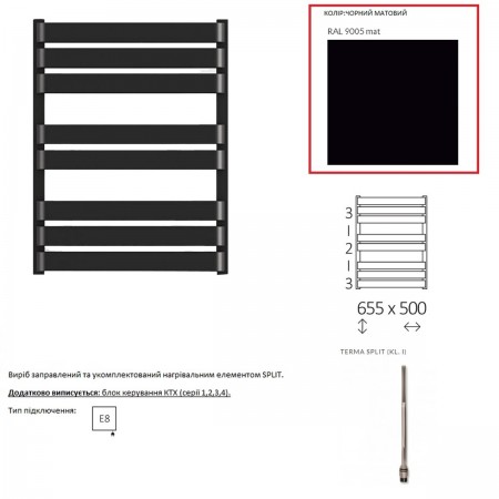 WLWAT065050K9M5E8TS1D Рушникосушка електрична Terma WARP T 655*500 ,колір RAL 9005 mat (чорний мат),
