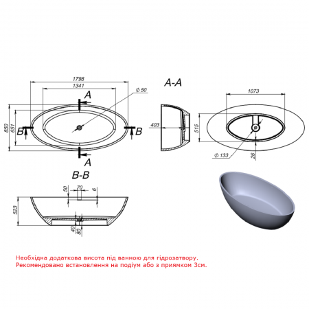 18080130U Ванна ART штучний камінь з сифоном 179,8x85 см, білий глянець (1 сорт)