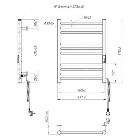 6.1.0300.06.BM Рушникосушка ел. HF Greenwich 570x430 чорний мат, в комплекті з прих.підкл (1 сорт)