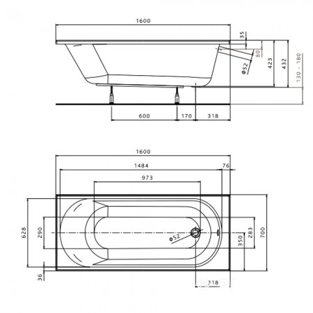 XWP136000N OPAL PLUS Ванна акрилова прямокутна 160х70 см, біла, без ніжок (1 сорт)