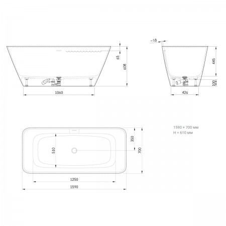 VAQUA/00 QUADRO Ванна окремостояча 159х70 см з литого (штучного) каменю, з інтегрованим сифоном, кол