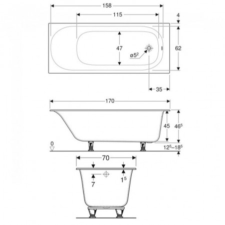 554.002.01.1 Soana Ванна прямокутна 170x70см, тонкий край, злив та перелив в зоні ніг, з ніжками, ко