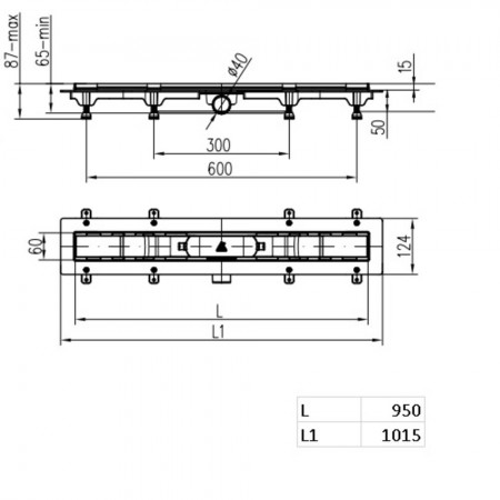 CH 950 KN 1 Душовий канал 950 мм з матовою решіткою Класік та Під плитку, нержавіюча сталь, горизонт