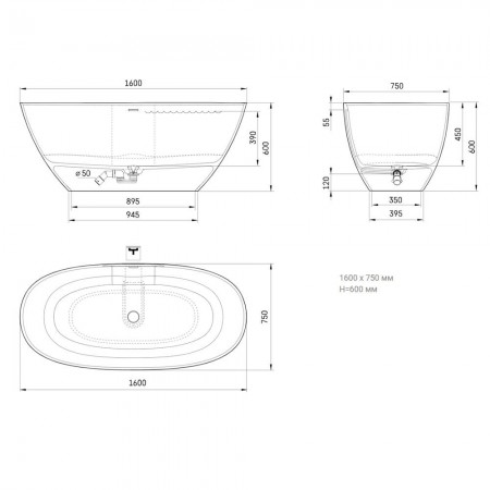 VAPERL/00 Perla Ванна окремостояча 160*75 см з литого (штучного) каменю, з інтегрованим сифоном, кол
