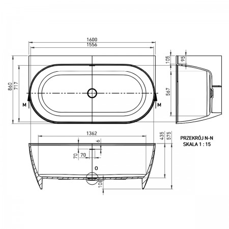160.086.043.1-3.0.3.X.X Ванна Scorpius Lite пристінна, з переливом та сифоном, біла, штучний камінь,
