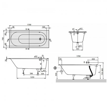 uBQ177OBE2V-01 OBERON Ванна 170х70см + ніжки, білий (1 сорт)