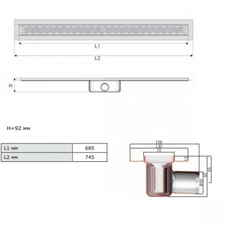 9010.88.22 (408722) Душовий канал з горизонтальним фланцем низький сифон 685мм (1 сорт)
