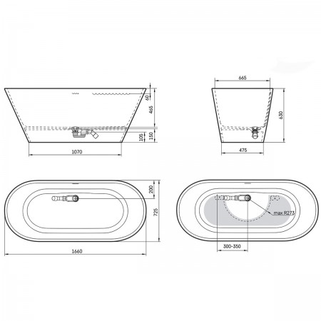 17070130W Style Ванна окремостояча 166x72,5 см з литого (штучного) каменю Caststone, з інтегрованим